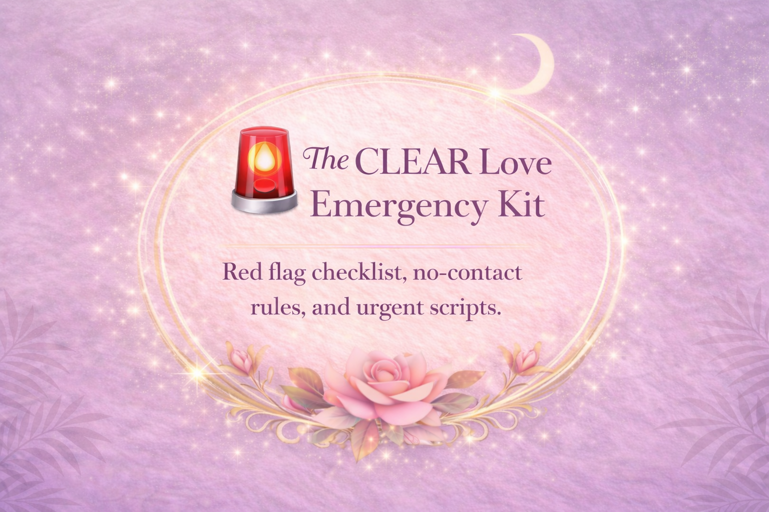 The CLEAR Love Emergency Kit is a quick-access set of tools for dating emergencies—when you feel triggered, confused, tempted to text, or stuck in a hot-and-cold cycle. It includes a Red Flag Checklist, No-Contact Rules Sheet, and copy/paste emergency scripts to help you pause, get clarity fast, and protect your peace.